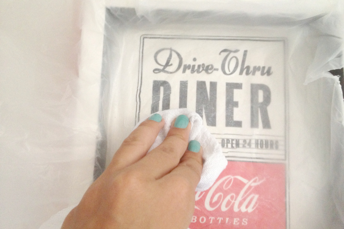 Passe cola branca diluída em 50% de água (usei 1 colher de sopa de cola e 1 colher de sopa de água) na superfície onde você colocará o guardanapo.