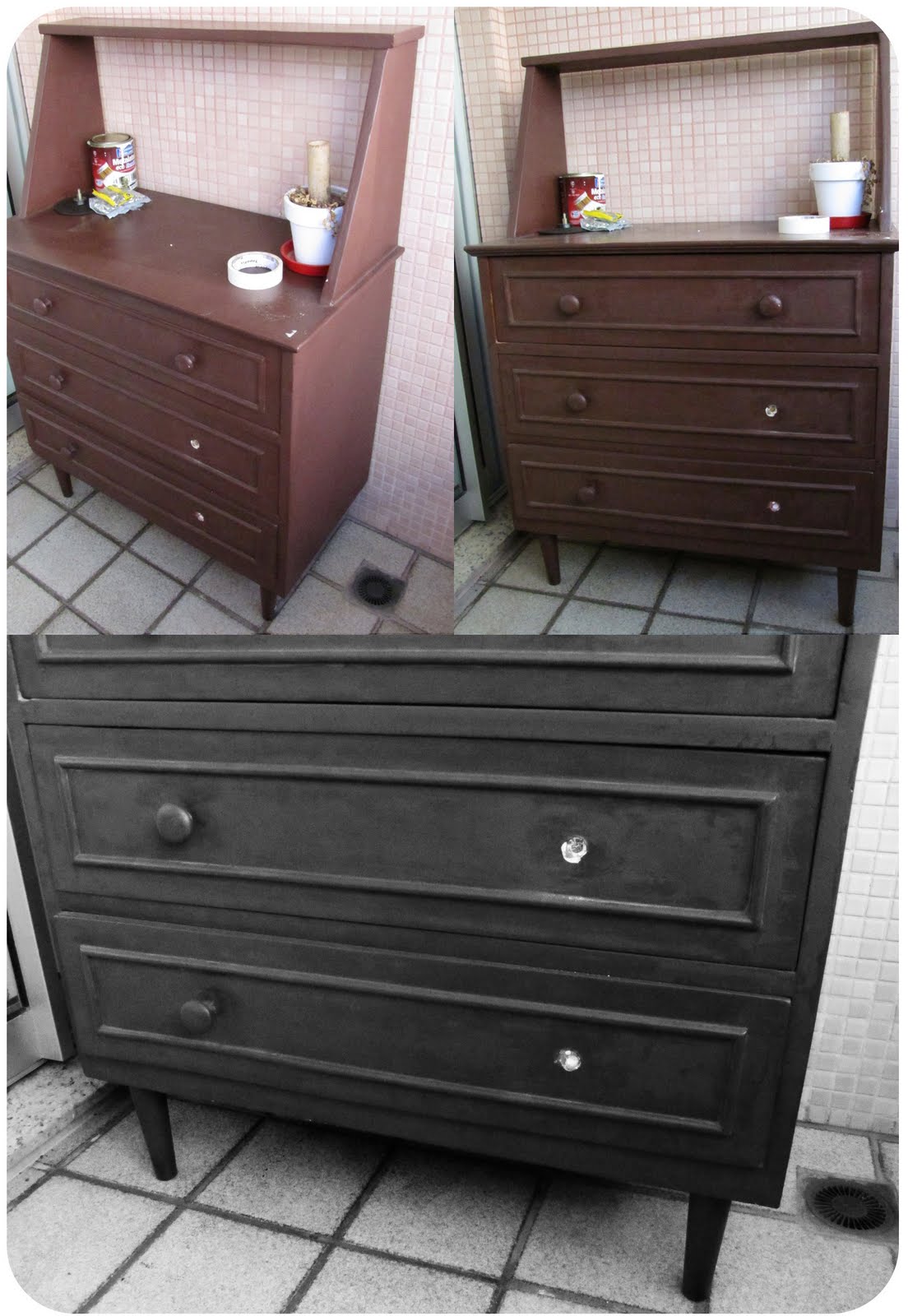 Duas mãos de tinta. Meia hora entre uma mão e outra e tchanann: cômoda quase nova. A tinta em spray é ou não é um material abençoado?