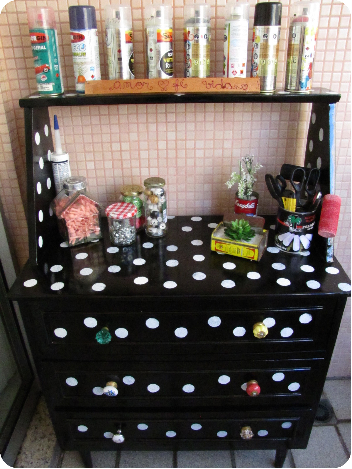 E pra quem tava curioso pra saber que raios é essa tal de Síndrome de Galinha D’Angola… aí está. Eu sou apaixonada por tudo que é preto de bolinha branca, sabe? Tenho fronha, vestido, enfeite de cabelo e agora até um mini-ateliê. 🙂