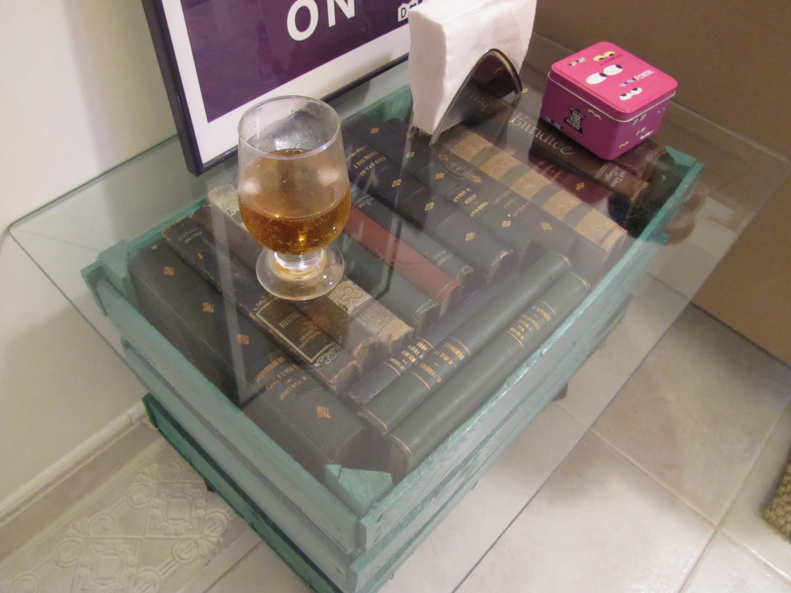 Como eu tenho uma coleção de livros muito antigos que eu adoro, resolvi colocá-los dentro da caixa e protegê-los com um tampo de vidro. Meu primeiro projeto ficou assim ó: